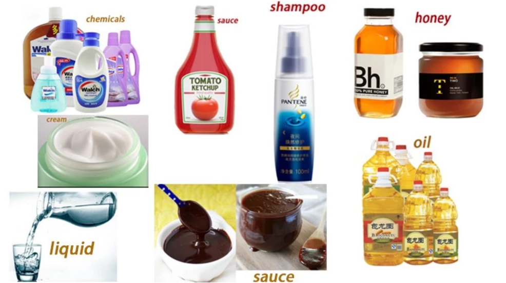 Halfviskeuse en viskose vloeistowwe; catsup, mosterd, stroop, salsa, mayonnaise, heuning, grondboontjiebotter, jellies, doop souse, lipbalsem, sjampoe, dik seep, styl gels, gesigsmaskers, was, gom, ghries, seëlmiddels, silikoon en nog baie meer
