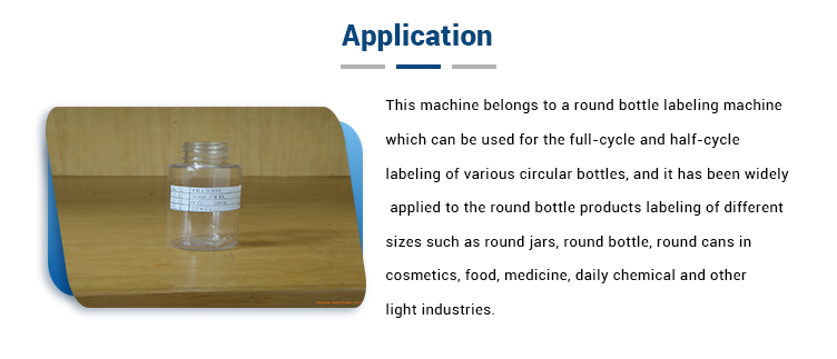Hierdie masjien behoort aan 'n etiketmasjien vir ronde bottels wat gebruik kan word vir die volledige en halfsiklus etikettering van verskillende sirkelflesse, en dit is wyd toegepas op die etiket van ronde bottels in verskillende groottes, soos ronde flesse, ronde bottel , ronde blikkies in skoonheidsmiddels, voedsel, medisyne, daaglikse chemiese en ander ligte nywerhede. Samestelling van toerusting: Elektriese kabinet, transportmeganisme, aparte botteltoestel, roletiketapparaat, kwasetiketapparaat, 1 # etiket-enjin, bedryfstelsel en beheerstelsel.